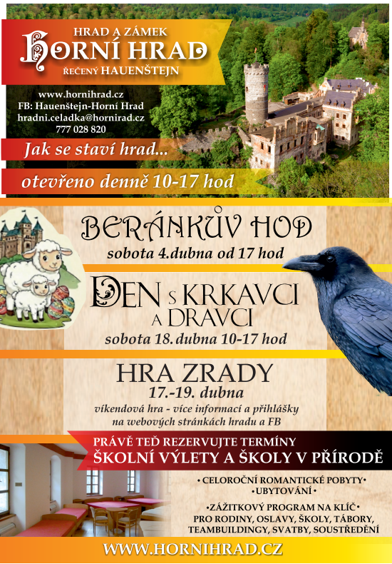 4. 4. – Hod beránka 17.–19. 4. – Zrádci 24. 5. – Dětský den na hradě 30. 5. – Noční prohlídka 13. 6. – Noční divadelní prohlídka (od 20:00) 27. 6. – Hurá prázdniny + strašení 1. 8. – Chvála medu 29. 8. – Hauenštejnské slavnosti 12. 9. – Závěrečná noční divadelní prohlídka Navigace pro příspěvek Hornohradský táborHORNÍ HRAD – PROGRAM 2026: